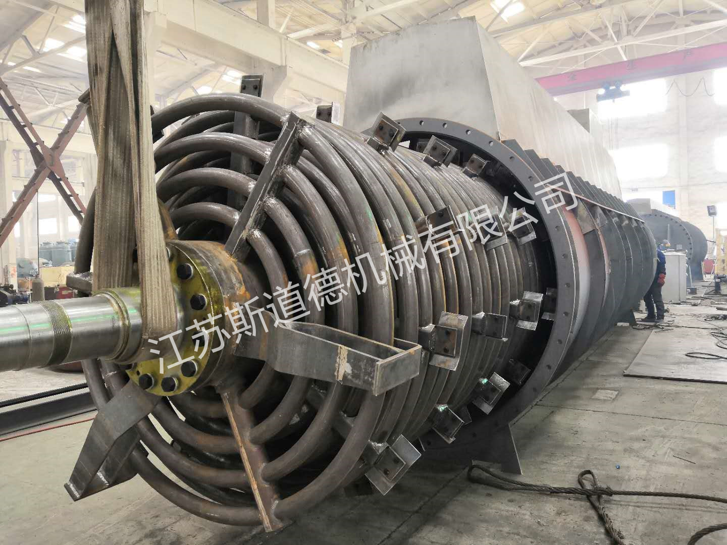 ?? PGD型盤管式干燥機(jī)不僅外殼可進(jìn)行加熱,同時(shí)內(nèi)部轉(zhuǎn)子也進(jìn)行加熱,大大增加了干燥面積,提高熱效率,確保物料徹底干燥。干燥機(jī)是由一個(gè)橫臥的外殼和一個(gè)帶有多套加熱管的轉(zhuǎn)子所組成,轉(zhuǎn)子上安裝多個(gè)加熱管,管上裝有可調(diào)節(jié)角度的推料器,在工作時(shí)既能加熱物料,又可將物料沿出料端方向推進(jìn)。轉(zhuǎn)軸內(nèi)部的蒸汽分布裝置能使蒸汽均勻地分布到每一件加熱盤管內(nèi),蒸汽在盤管內(nèi)流動(dòng),使加熱盤管保持恒定的溫度,冷凝水通過軸端特殊的裝置排出。